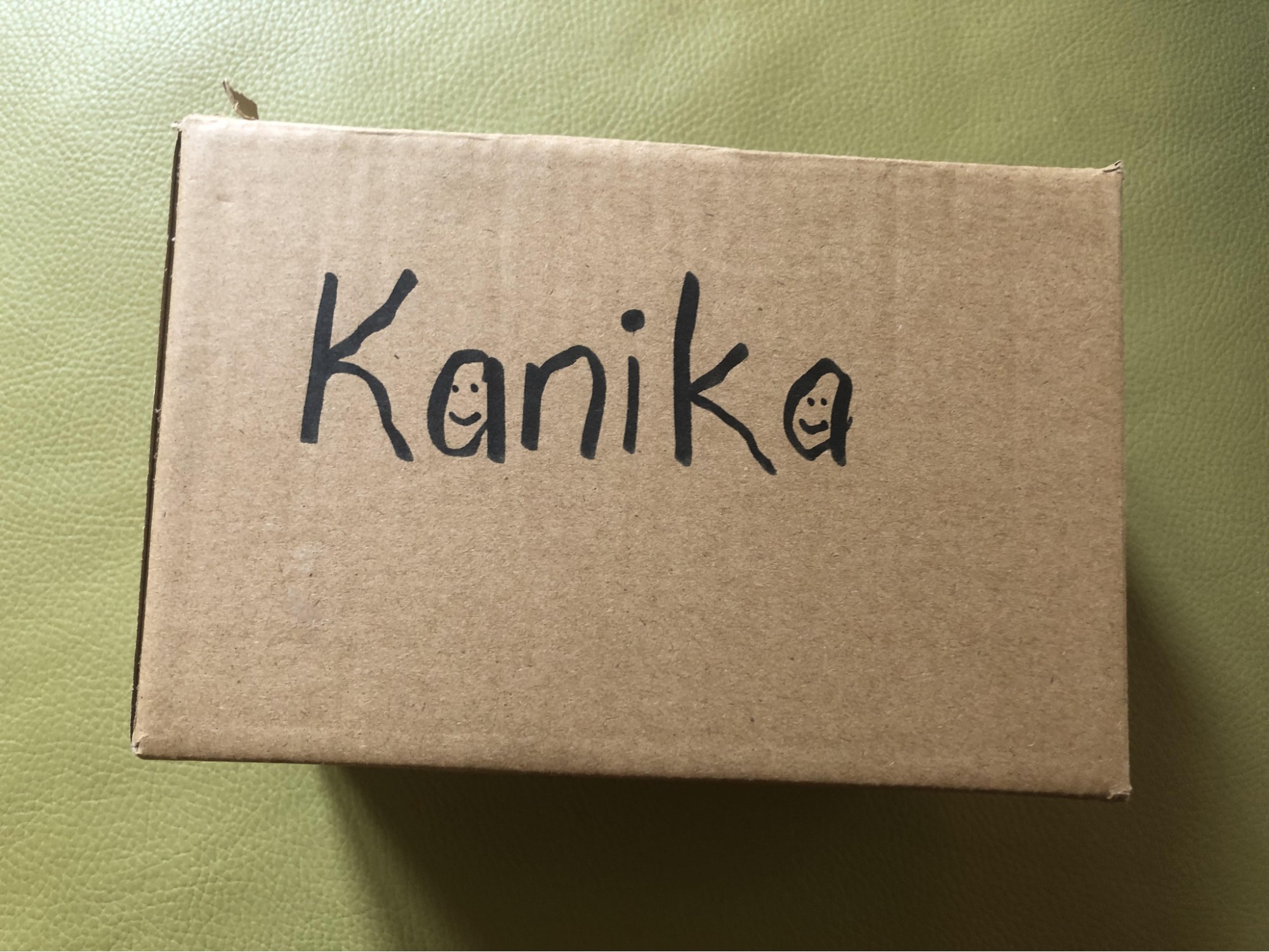 A small shipping box sealed with packing tape that reads, ‘Kanika’, in marker. Both letter As have a smiley face on the inside.