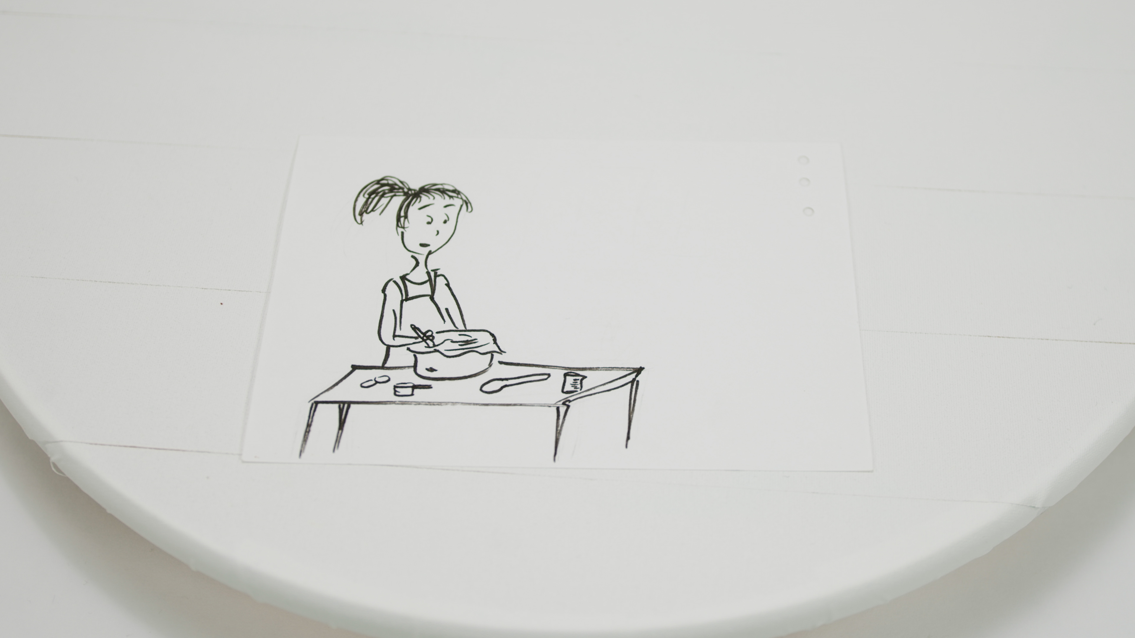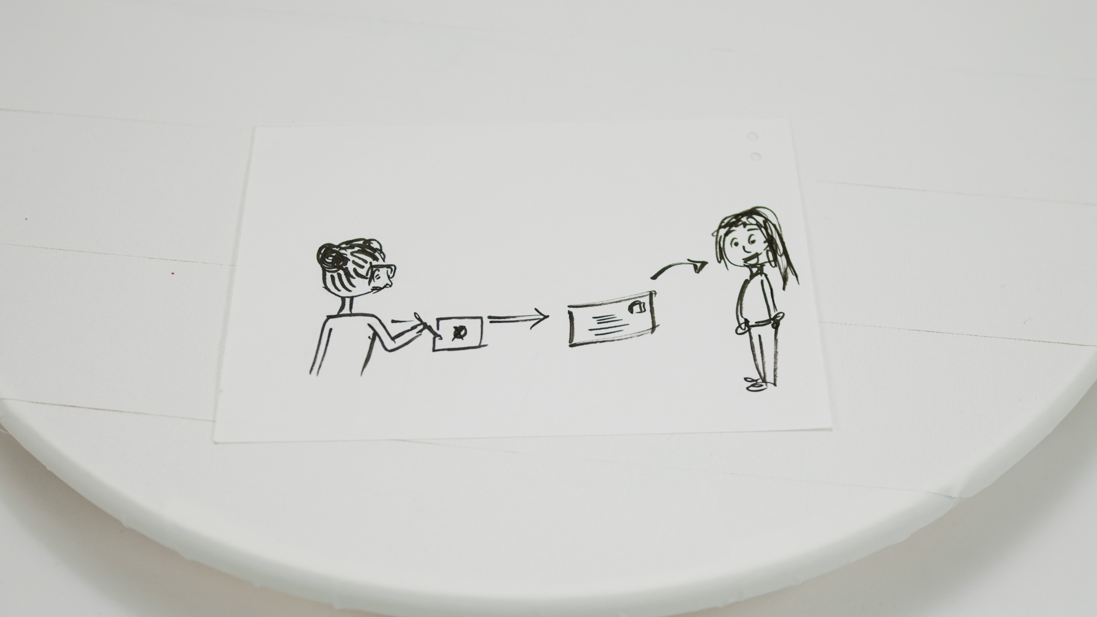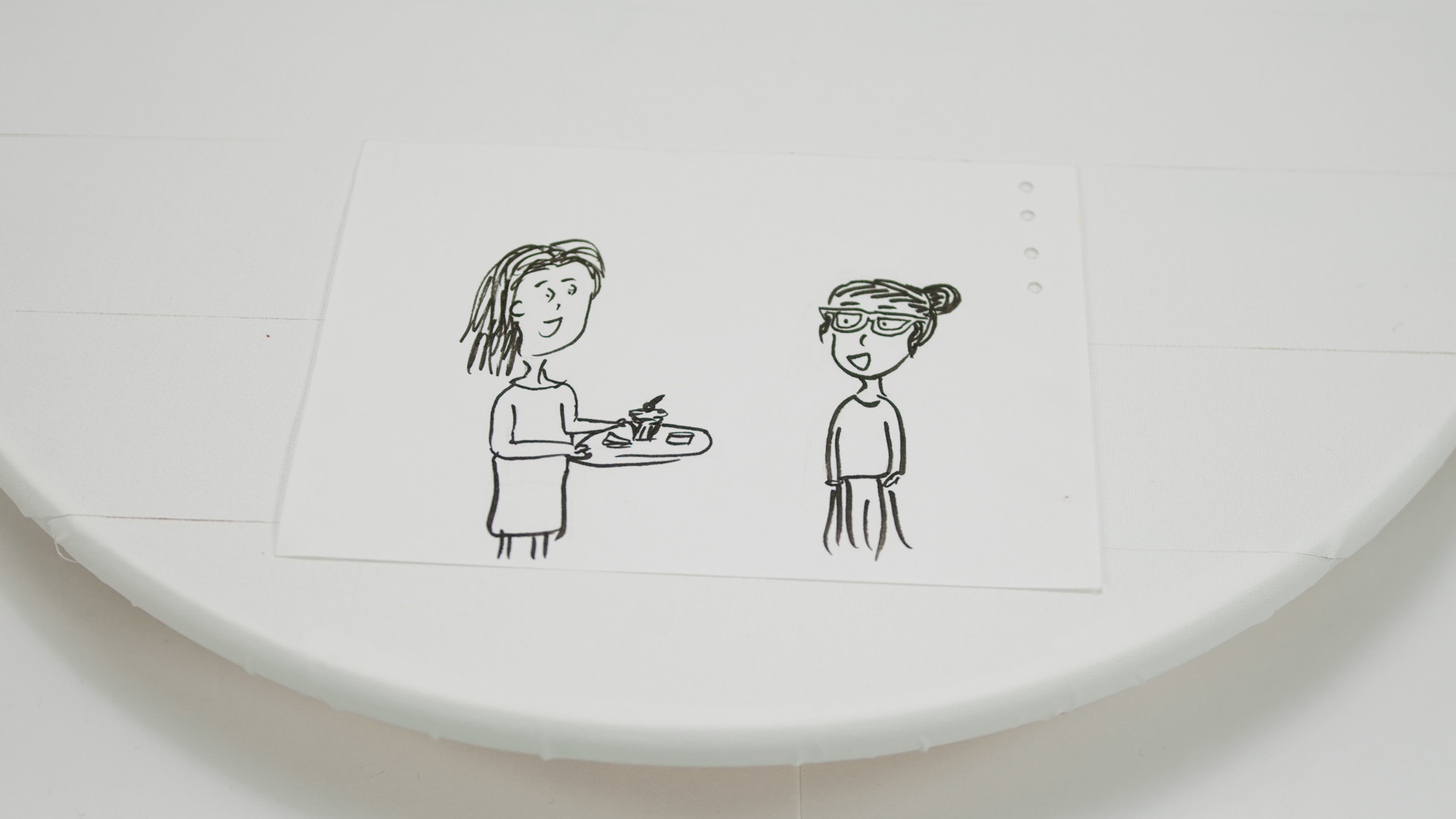 Four small pieces of paper featuring illustrations in black marker. The first paper shows a woman wearing red glasses sitting on the ground. Her expression is unhappy and she clutches her stomach. She is surrounded by a milk carton, a peanut, a fruit bowl, a bar of chocolate, and some wheat. Next to the wheat is a cluster of wheat/gluten food products. There is a face in the bottom, half red and half blue, the red side looking upset and the blue side looking happy with its tongue sticking out. The foods have either red Xs or blue ticks next to them indicating likes vs. dislikes or potential allergies. The second shows the woman with glasses holding a pen and a piece of paper containing a crossed out circle. To the right of the woman is an arrow pointing at a stamped letter which is followed by another arrow pointing to a smiling woman with straight hair. The third shows the woman with straight hair standing at a table and mixing something in a bowl. She wears an apron and her hair is in a ponytail. A few baking supplies are scattered on the table. The fourth shows the straight haired woman presenting a cupcake to the woman wearing glasses. They are both smiling.