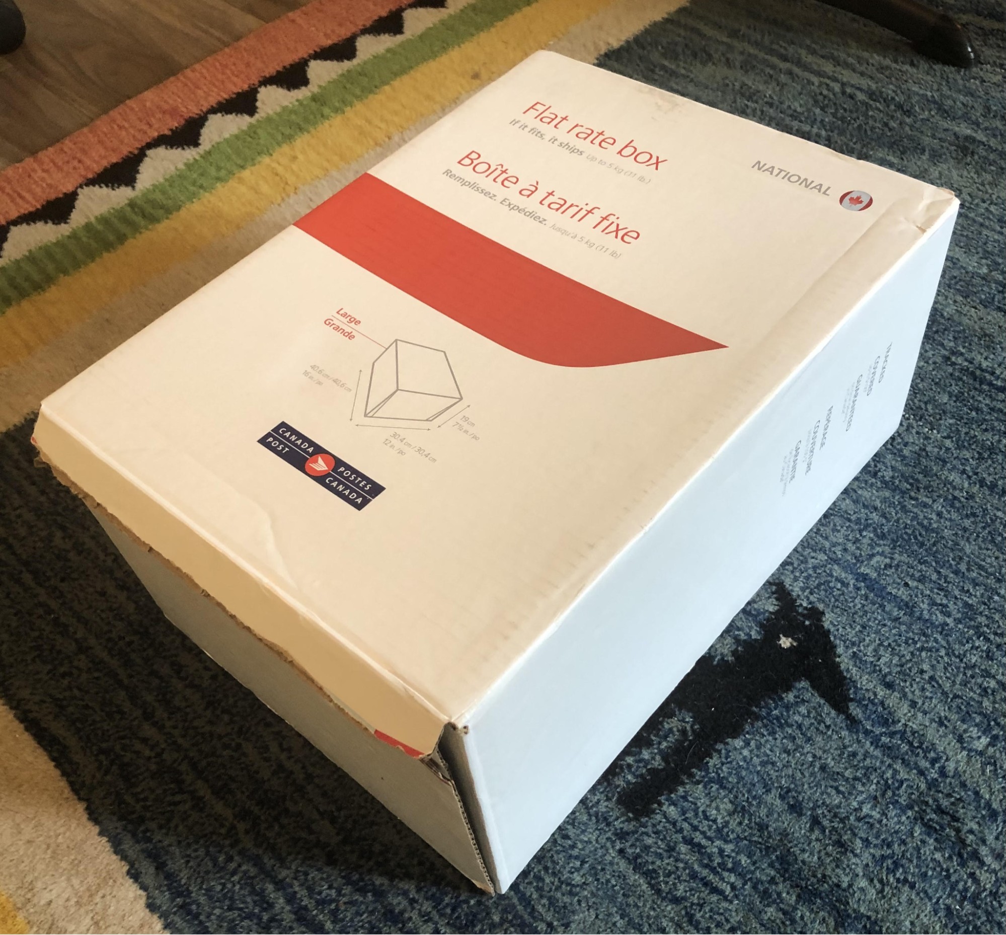 A large white Canada Post flat rate shipping box with red accents. There is a drawing of a box, indicating its dimensions. Below is the Canada Post logo.
