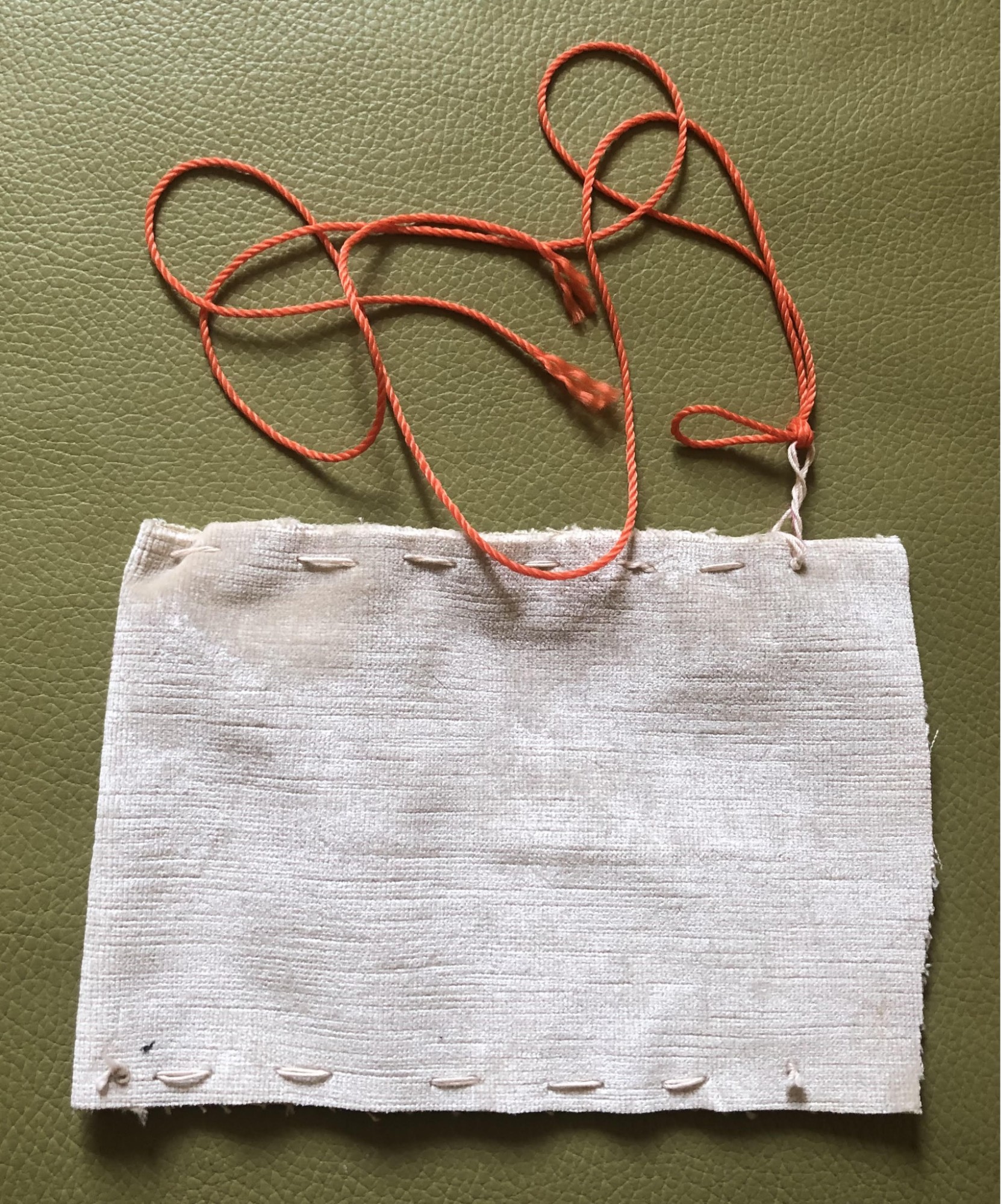A beige velvet pouch stitched with matching string. A long orange string is knotted to one of the corners of the open end of the pouch. It might be used to close the pouch or tie it to something. The purpose of the pouch is to hold all of the Artefact 8 series.